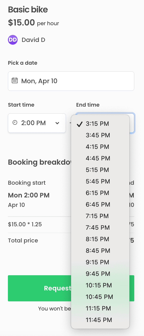 Sometimes, there are cases where you want to have a basic length for a booking and then different lengths for subsequent time slots. For instance, a listing could feature a 75 minute default bike rental with the option to extend it for 30 minutes at a time. In those cases, you need to create different handling for the first time slot, i.e. the first start and end boundaries.