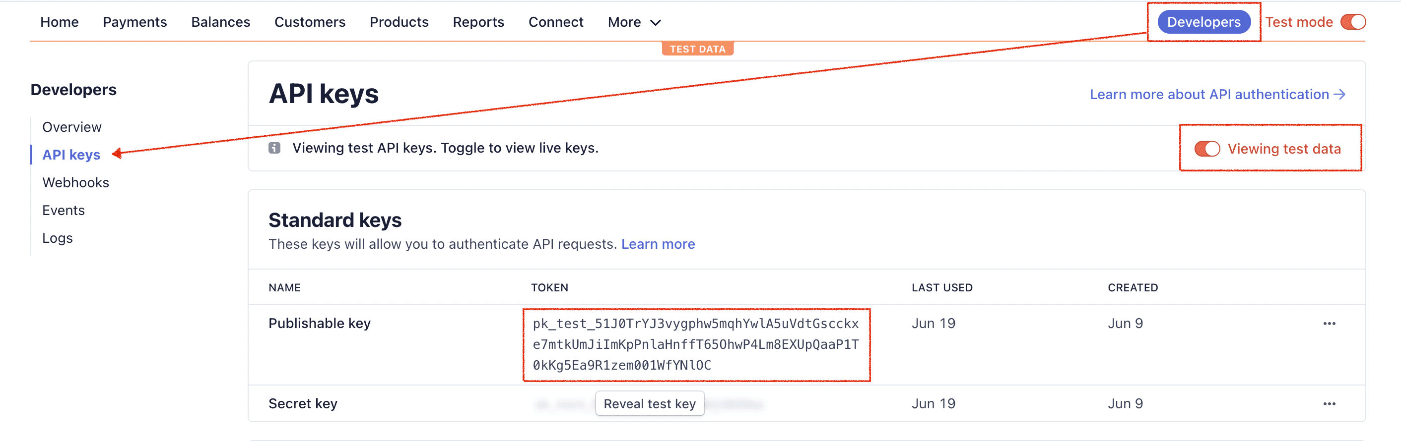 If you want to use test data in development, make sure that the "Viewing test data" toggle is on. This way no real money will be used. In production, make sure that the toggle is off.